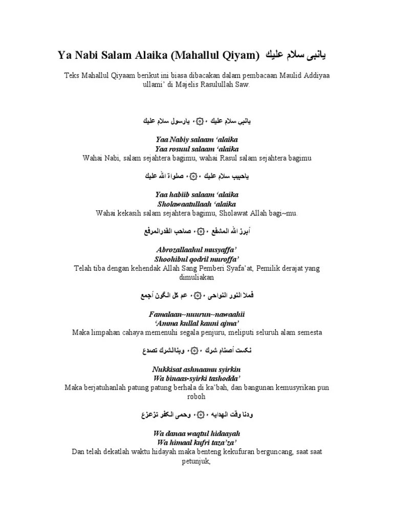 Wahai nabi, salam sejahtera untukmu, wahai rosul salam sejahtera untukmu. Bacaan marhaban al barzanji maulid nabi dan . Wahai kekasih, salam sejahtera untukmu . Lirik mahalul qiyam lengkap arab latin dan terjemah. Teks mahalul qiyam arab pdf.